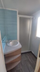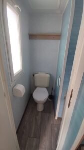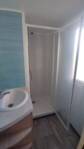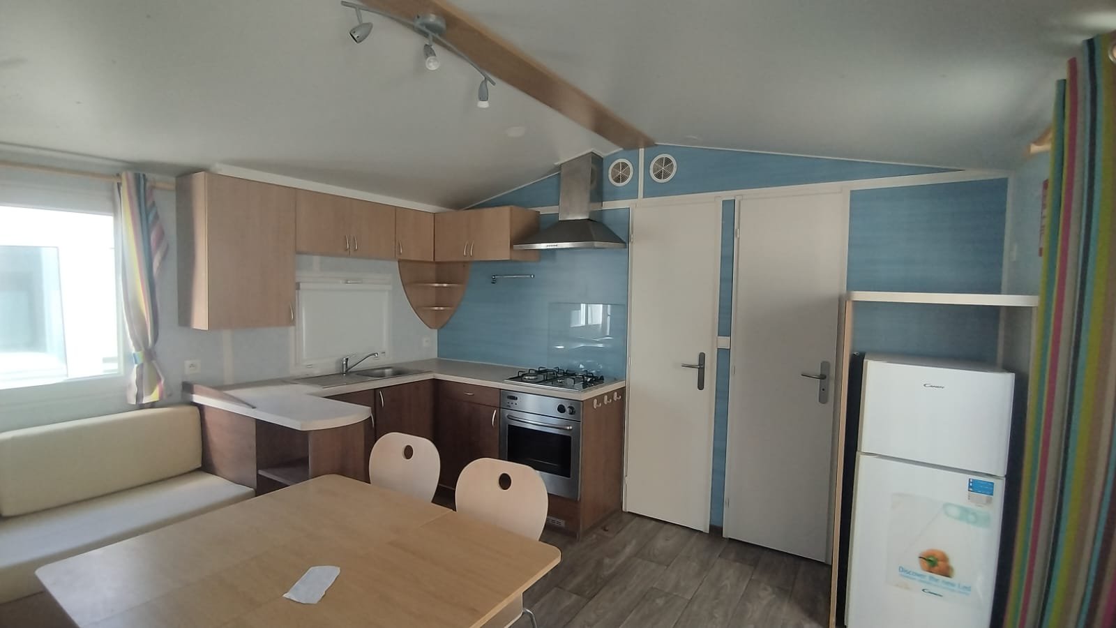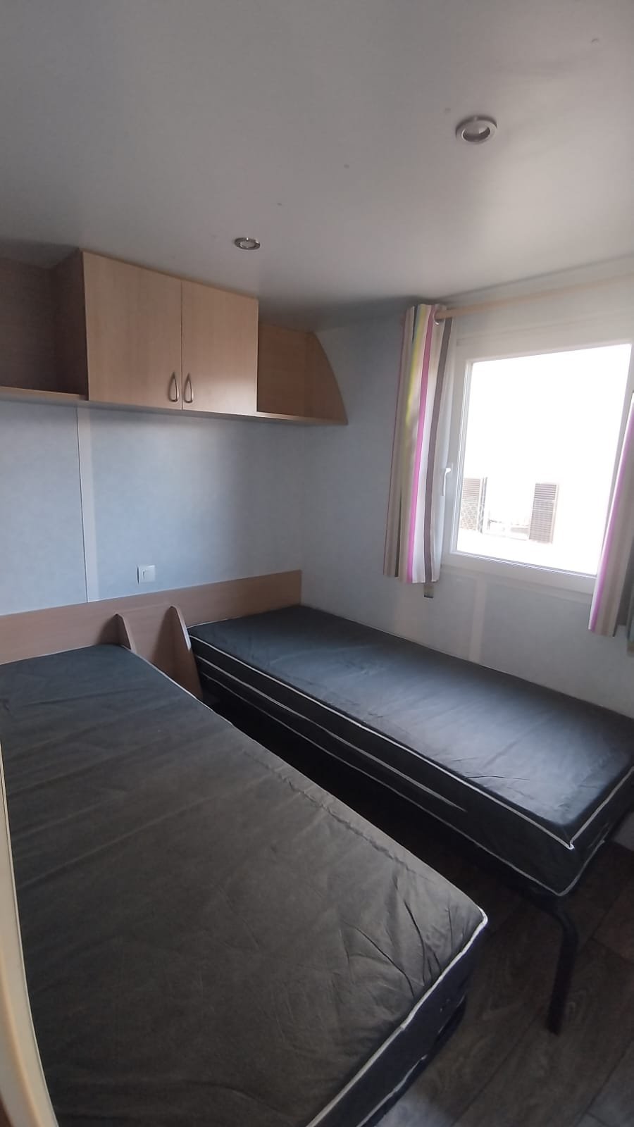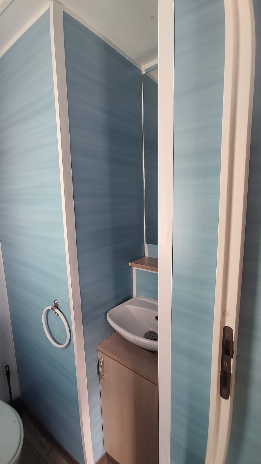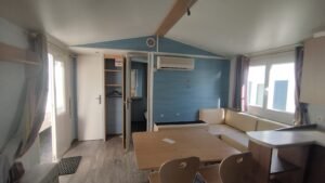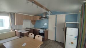 Área total: 32 m²Mobilhome equipada com ar condicionado. Composta por uma sala de estar com cozinha totalmente equipada, incluindo frigorífico grande, exaustor, fogão, forno e esquentador. Conta com um quarto com cama de casal e um quarto com duas camas. Inclui uma casa de banho completa com chuveiro e lavatório, além de uma casa de banho de serviço com sanita separada.