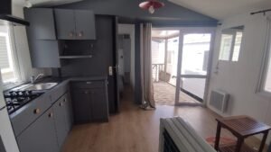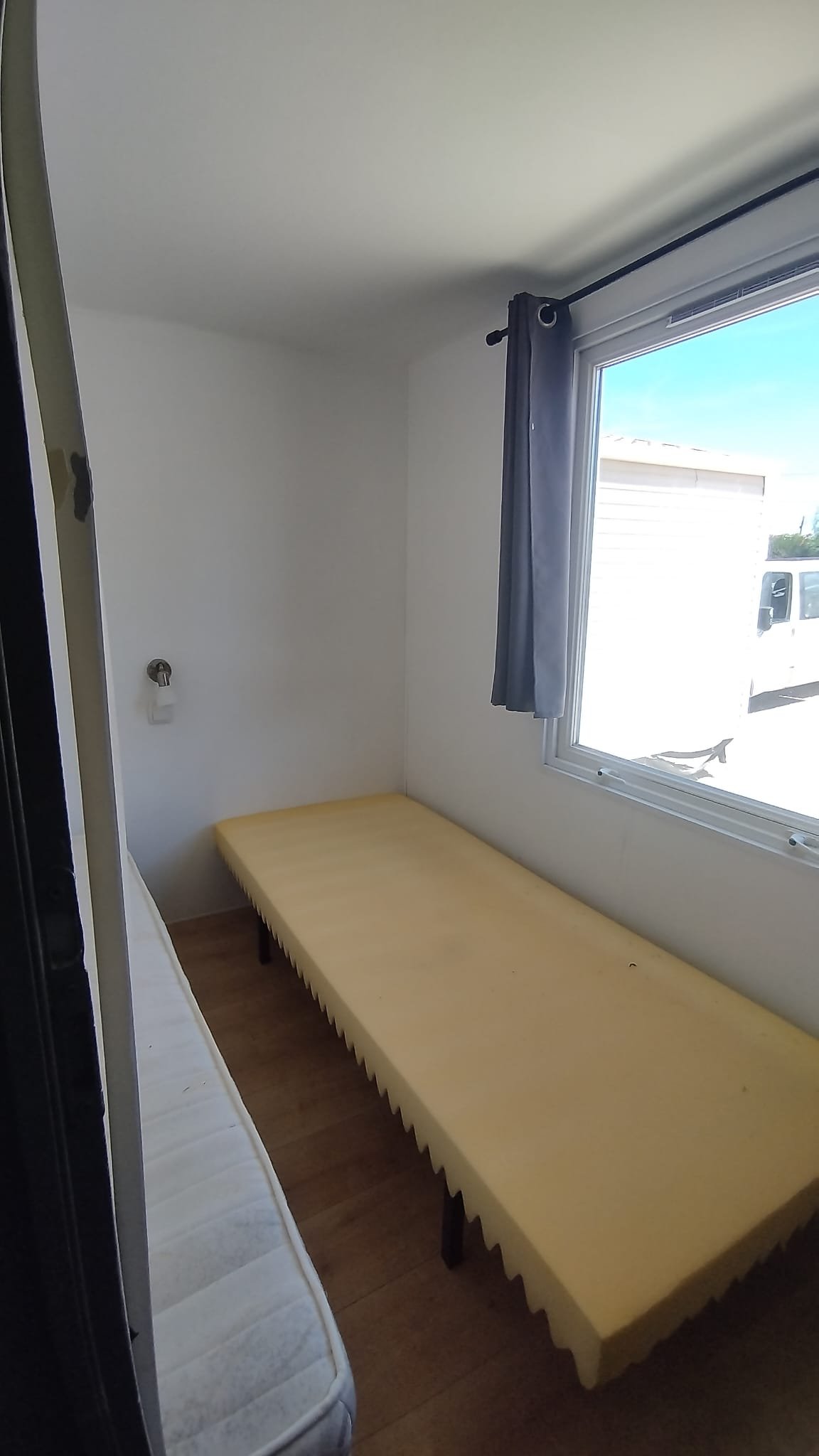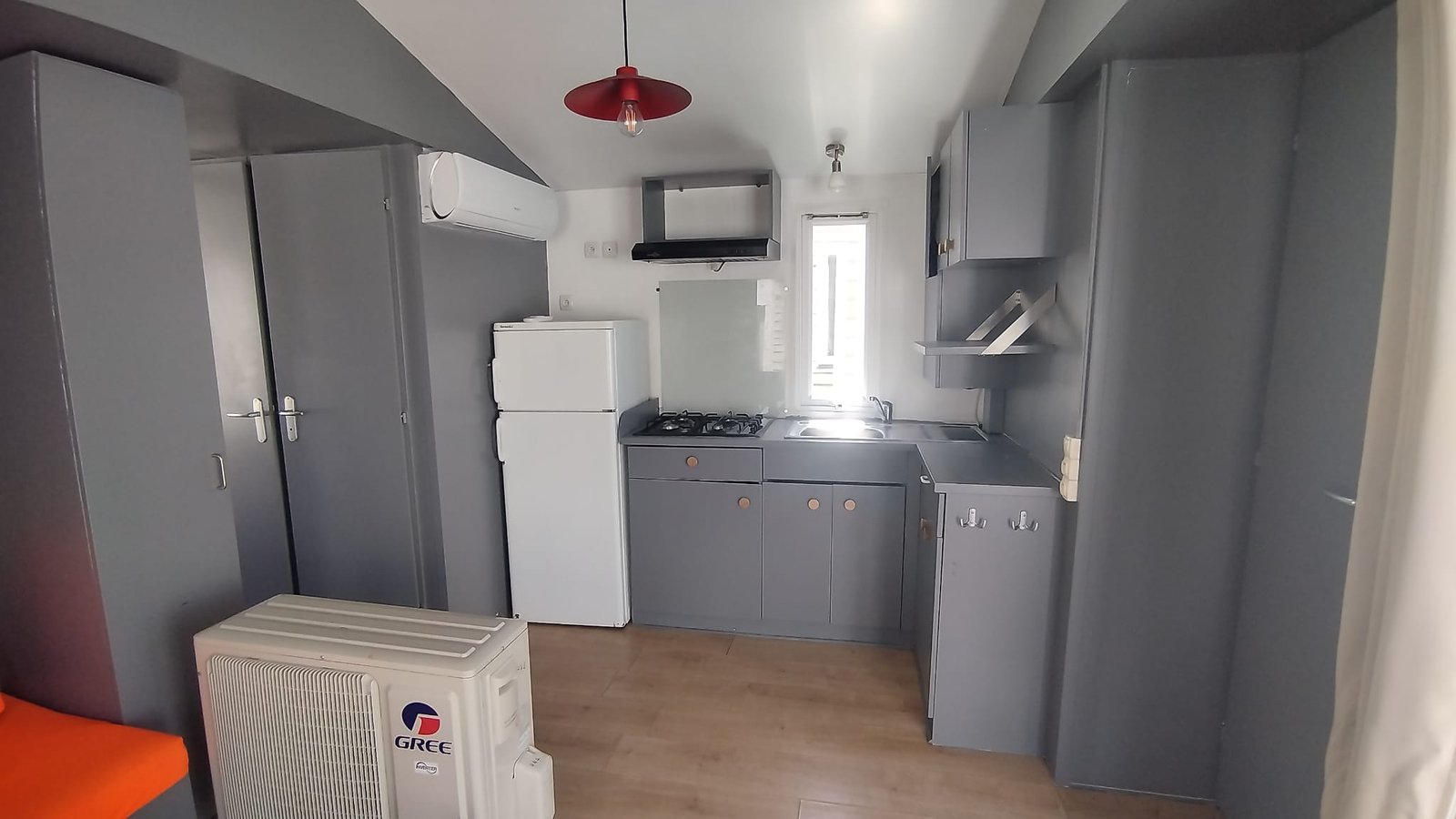 Área total: 31,6 m²Mobilhome equipada com ar condicionado. Composta por uma sala de estar com cozinha totalmente equipada, incluindo frigorífico grande, exaustor, fogão e esquentador. Conta com um quarto com cama de casal e um quarto com duas camas. Inclui uma casa de banho completa com chuveiro e lavatório, além de uma casa de banho de serviço com sanita separada.