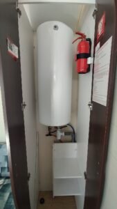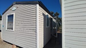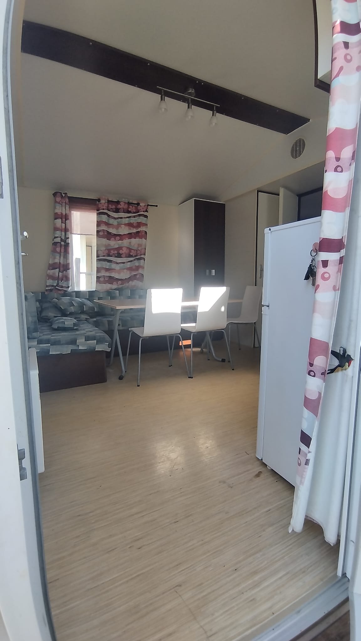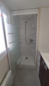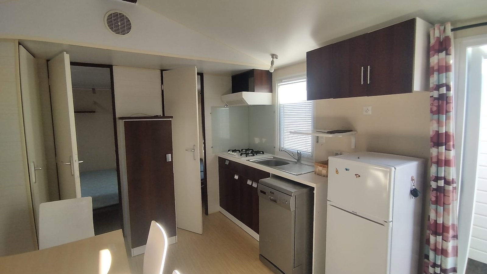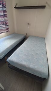 Área total: 31,2 m²Mobilhome equipada com máquina de lavar loiça. Composta por uma sala de estar com cozinha totalmente equipada, incluindo frigorífico grande, exaustor, fogão e esquentador. Conta com um quarto com cama de casal e dois quartos com duas camas de solteiro. Inclui uma casa de banho completa com chuveiro e lavatório, além de uma casa de banho de serviço com sanita separada.