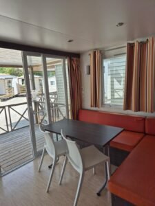 Área total: 33,6 m²Casa composta por uma sala de estar com cozinha totalmente equipada, incluindo frigorífico grande, exaustor, fogão e esquentador. Conta com um quarto com cama de casal e um quarto com duas camas. Dispõe de uma casa de banho completa com chuveiro e lavatório, além de uma casa de banho de serviço com sanita separada. Os quartos possuem persianas.